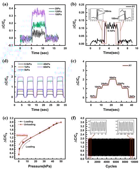 In addition to sensitivity, the detection limit, response time, stability, and repeatability are important indicators for the performance evaluation of pressure sensors. In this experiment, the P7 sample, which showed the highest performance, was used for sensor evaluation. As shown in Figure 5a, the fabricated sensor can detect a small pressure of 20 Pa. The pressure response curve shows clear steps when pressure is applied or removed and demonstrates an excellent ability to detect external stimuli. Under a quickly applied pressure, the sensor exhibits a quick response and recovery time of approximately 100 ms in the loading and unloading processes (Figure 5b). The sensor’s rapidly increases or decreases at the loading/unloading points. Figure 5c shows the results of five repeated inputs of the pressures from low to high pressures (0.5 kPa, 1 kPa, 5 kPa, 40 kPa, and 60 kPa). The rate of change of capacitance showed a tendency to increase in proportion to pressure, while it remained constant under the same pressure. Furthermore, as shown in Figure 5d, stable capacitances were observed when pressures were input step by step (10 kPa, 25 kPa, 50 kPa). Considering the changes in the pressure response curve, the hysteresis of loading and unloading showed a significantly small and negligible capacitance change, as seen in Figure 5e. Furthermore, the dynamic pressure of 50 kPa provided by the tension/pressure tester was measured by the pressure sensor. As shown in Figure 5f, the durability and repeatability of the sensor were tested by repetitive loading/unloading under a pressure of 50 kPa for 10,000 cycles. The stable detection performance of the sensor was demonstrated for several thousands of tests.