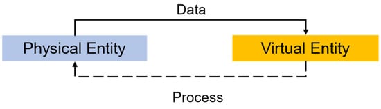 The generic methodology for the construction of a digital twin framework and its application is based in Figure 2, which displays the schematics of the relationship between the digital twin components [24]. A twinning process is based on the virtual-to-physical and physical-to-virtual relationships in which identical scenarios are presented in both environments. The main concepts and processes needed for a digital twin are presented below.