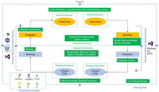 Physical entity refers to the grow beds, and virtual entity refers to the built model that mimics it. The physical environment are all the components listed in Section 3.2, and the virtual environment are the virtual entity, information displayed, and the graphical user interface (GUI). The parameters are the sensor measurements. The values of the components are considered the state of the parameters.