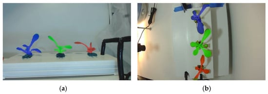 In the ‘Home’ window, a replica of the physical entity (NFT channel) is designed and acts as the main component of this interface. Interactive and resizable reproductions of the plants are modeled, and the current size of the crops in the physical side at real time are mimicked in the virtual environment. Information about the growth rate and weight of each of the plant is displayed. For the plant’s growth, a decision model is built to categorize the actual size of the plant and assign a stage from 1 to 12. This categorization is made by calculating the growth area along the 14 days from previous runs, averaging them and dividing them evenly throughout the 12 stages; thus, every stage corresponds to an area interval (i.e., stage 1: 0 cm2 to 1 cm2). Based on this level, the scalable digital model that represents the plant current growth status is displayed to the user. The second window is named ‘Sensors Tracking’, where tracking graphs for each sensor are displayed with the historical values of the sensors and is updated every 5 min synchronously with the ‘sensors-records’ table. Third, the ‘Database’ window is where the all the entries of the ‘sensors-records’ are displayed. Fourth, ‘Imaging’ gives the user the opportunity to visualize the segmentation output of the masked leafy vegetables, as seen in Figure 5, and to identify potential problems in the image processing results. As explained before, top and side pictures are taken of the plants every 30 min, with the purpose of extracting information about the state of the plants (see Table 1). Once a new set of pictures is available, a Python script is executed to run a prediction model to identify the plants’ location and extract the features of each of them using instance segmentation. At this point, the digital interface connects to a specific folder and retrieves the masked images to present them in the window ‘Masked images’ for the user. The features from the plants are saved into a MySQL table named ‘masked-results’. A structured procedure is designed into MySQL to be triggered by the insertion of a new value in this ‘masked-results’ table; therefore, it constantly calculates the average of the area, height, width, and depth features, grouping by view, instance, and date. This data is saved in a new table named ‘accumulative-masked-records’. Fifth, the ‘Predictions’ window is where the predictive models used show their results. This window displays, through graphs at the record level, the side and top area of each of the plants and the daily calculations automatically made by the MySQL procedure. The digital interface by itself calculates the growing rate based on the change in the area of the plant and the fresh weight of the plants using the values in named ‘accumulative-masked-records’, and the logistic linear model shown in Equation (1) and Table 2. Lastly, the ‘About’ window displays information about the working principle of the interface.