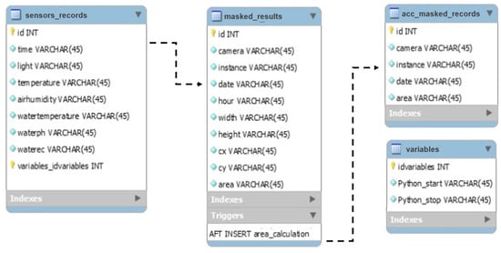 The IoT sensing module processes the values from the different sensors and sends the information through a digital access point to the Raspberry Pi every five minutes. The main controller formats and inserts the values in a MySQL database at the local level using PHP. During this process, a host computer executes a parallel process using the growth rate and fresh weight models and sends the obtained results to the main database every 30 min, synchronously with the other records. Figure 6 shows the model of the relational database designed with the tables and relationships used.