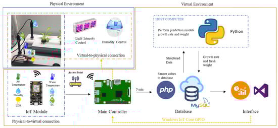 The physical–virtual connection is achieved using a wireless sensing module, php, MySQL, and the connection from the visual studio to the database in the network. Here, the metrology is the action of sensing the parameters, and the realization in the physical system corresponds to the database construction with the process of gathering and analyzing the raw data. The virtual–physical connection is executed using the IoT Core module and Visual Studio to control the outputs in the main controller. The metrology stage in this connection mode refers to the growth rate and fresh weight estimation using the prediction models and the logical process to evaluate the sensed values against the optimal levels. The realization, on the other hand, in this case, is the action to turn on or off the outputs depending on the conditions. Physical processes are specifically the growing of the plants and the processes involved (water flow, humidity, light), and the sensing of the parameters. Virtual processes correspond to the execution of the prediction process, the logical classification of the levels, and the remote monitoring and control of the system. Lastly, the twinning rate is determined by the one second for the display of the sensors values, the five-minute interval between the database records, and the thirty-minute time-lapse between predictions.