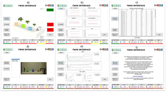 Digital twin interface: (a) ‘Home’ window; (b) ‘Sensors Tracking’ window; (c) ‘Database’ window; (d) ‘Imaging’ window; (e) ‘Predictions’ window; (f) ‘About’ window.