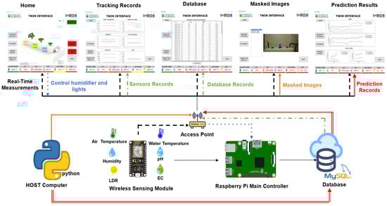 The two cameras are connected to the Raspberry Pi and work with scheduled scripts that take pictures every 30 min from 6:00 am to 6:00 pm. The growing lights, the camera ring, and the humidifier are connected to the four-channel relay module which is triggered by outputs from the main controller. For the sensor modules, all of them are installed in an Arduino Nano with the corresponding configurations. The pH and electroconductivity sensors are connected to a two-channel relay module to avoid measuring problems. In addition, an ESP8266 Wi-Fi Sensor is installed in the Arduino, allowing the data to be transmitted wirelessly to the main controller (Raspberry Pi) and to the twining interface for real-time sensor values display.