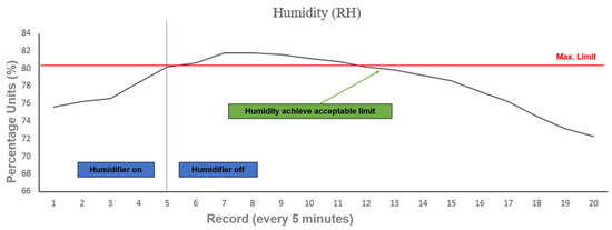 As a basic procedure to prove the working principle, and as a first step of the future work related to the autoregulation of an aquaponic system, the interface can autonomously turn on/off any actuators of the system, i.e., the humidifier or the growing lights, by sending an instruction to the Raspberry Pi through the IoT Core module in Visual Studio to activate or deactivate the relays (as shown in Figure 10). To validate this communication and test the virtual-to-physical connection, the order to turn off the humidifier is sent after detecting ‘humidity’ values out of the limits. Figure 11 shows relative humidity (RH) values during the reported experimental setup. As observed, once the current value of the humidity in the system reaches the maximum acceptable value of 80% (see Table 4), the humidifier is turned off. After a brief period of overpass, the system humidity starts to decrease progressively until it returns back to acceptable levels. The humidifier will remain off until the lower limit for acceptable humidity (50%) is reached, at which point it will be turned on again.