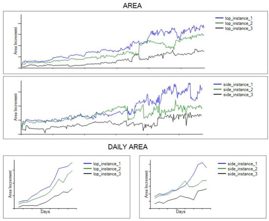 Visualization of the area trends in plants, based on overall system growth (top) or individual instances (bottom).