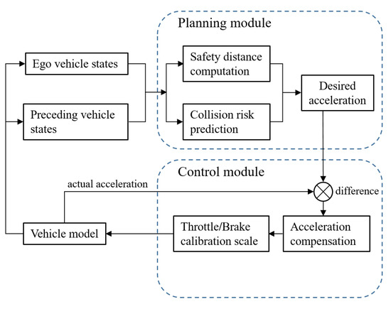 However, collision easily happens when there is a low speed or sudden deceleration in the preceding vehicles. In the absence of predictive warning, real-world applications in vehicle-following scenarios pose certain risks [18]. The need to dynamically evaluate and predict collision risks during the course is increasing to enhance the safety performance [19,20]. Motivated by this, we focus on the longitudinal control for active collision avoidance in vehicle-following scenarios. In this work, we couple the motion of the ego vehicle and the preceding vehicles. The state information (velocity, acceleration, etc.) is collected from several vehicle sensors and is further utilized to carry out the computation of safety distance and collision risk. Based on the optimal control theory, an objective function is then established to solve the desired acceleration, and a longitudinal proportion integration differentiation (PID) control algorithm is introduced for acceleration compensation. Significantly, the objective function considers both the speed cost and distance cost, offering the necessary features to cover dynamic driving situations. The model of safety following distance is embedded in the distance cost to enhance safety capability. Finally, the controlling performance is investigated under different running modes in simulation. The logic structure is shown in Figure 1.