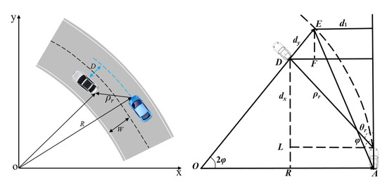 Here, we introduce a distance compensation algorithm supposing that the curve radius is longer than the distance radars can detect and the ego vehicle and adjacent vehicles share the same road curvature [24]. The state of longitudinal vehicle-following on curved roads is described in Figure 3. The ego vehicle is at A, and there is an adjacent vehicle at D. E is the vertical projection of D on the trajectory of the ego vehicle.