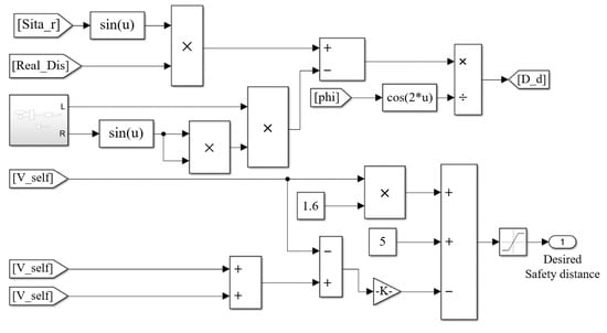 The proposed algorithm works by setting a safety threshold to . Here, the road width is set to 4 m and the threshold is set between −2 and 2 m. Once is within the threshold, the adjacent vehicle will be evaluated as an alternative of the following target by , which in turn would obviate the annoying disturbance. The ultimate model of safety following distance is depicted in Figure 4.