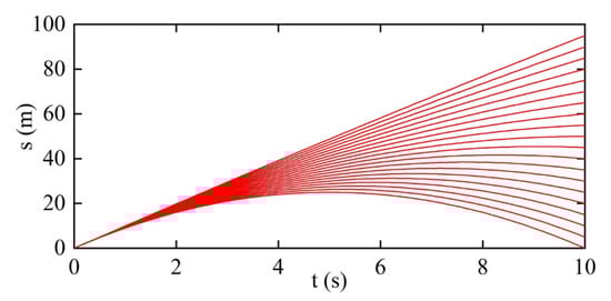 Starting from the current moment to the next 10 s, the travel distance of the ego vehicle under different acceleration is predicted in Figure 6. The travel distance of the preceding vehicle can be predicted likewise, using the detected velocity as an approximation for the real velocity in a time interval.