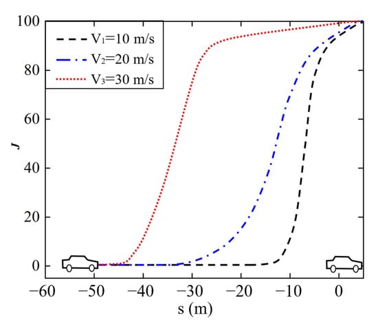 Significantly, the speed cost and distance cost jointly depict the collision risk when longitudinally following, as illustrated in Figure 8. It shows that the ego vehicle travels faster than the preceding vehicle and the velocity difference is relatively large; J would increase fleetly with the spacing distance getting shorter, ending in a timely deceleration in the ego vehicle. The larger the velocity difference is, under a same spacing distance, the faster J grows.