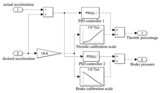 Generally, the desired acceleration is achieved by exerting sufficient brake pressure, which responds rapidly but makes passengers suffer in emergency situations. In this section, the longitudinal PID control method is introduced for acceleration compensation [29]. The brake pressure is combined with throttle percentage for adjustment to improve the ride comfort. The specific strategy and model of the longitudinal PID control are respectively shown in Table 1 and Figure 9. Proportionality coefficient , integration coefficient , and derivative coefficient are the three control parameters and are respectively assigned after deviation debugging as: , , .