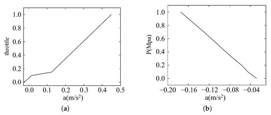 Additionally, in order that the throttle percentage and brake pressure can be consistent with the characteristics of vehicle engine and brake, they are fitted based on the looking-up table, as indicated in Figure 10.