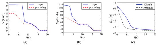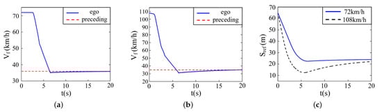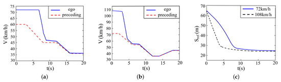 The simulation result is described in Figure 12, where (a) denotes the velocity variation when the ego vehicle drives at 72 km/h, (b) denotes the velocity variation when the ego vehicle drives at 108 km/h, and (c) denotes the variation of relative distance between two vehicles.