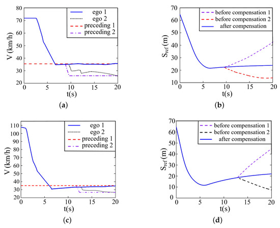 The simulation result is shown in Figure 15. Sub-figures (a) and (b) denote the following conditions with the initial velocity of 72 km/h, and (c) and (d) denote the conditions with the initial velocity of 108 km/h. The ‘ego 1’ marked in sub-figures (a) and (c) represents the velocity variation of the ego vehicle after distance compensation, and the ‘ego 2’ represents the velocity variation before distance compensation. The ‘before compensation 1’ and ‘before compensation 2’ marked in sub-figures (b) and (d) are the relative distance between the ego vehicle and two preceding vehicles, respectively, without distance compensation.