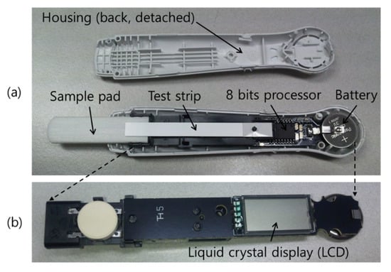 In a quantitative analysis system that performs colorimetric reading of latex particles, there is a commercialization case in a unique form that integrates an assay and a reader into one device. In 1987, Swiss Precision Diagnostics GmbH developed a pregnancy test kit using blue latex particles as a label, which is still being sold. The most unique feature of this product is that optoelectronics (i.e., sensors, LEDs, battery, etc.) that measure the intensity of the test line are integrated into the assay device as shown in Figure 4. The intensity of the test line is compared to a preset threshold, and the pregnancy status and post-fertilization time are printed on the black and white liquid-crystal display (LCD) window integrated in the kit. The latest product displays not only pregnancy status, but also how many weeks have passed since conception in words [19].