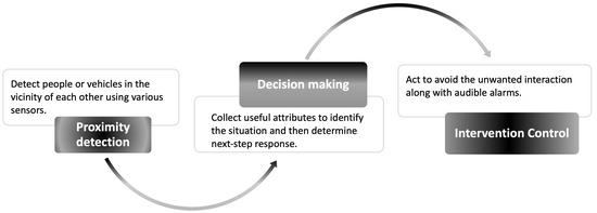 The decision-making part is mainly related to the logical judgements and making a final decision based on the instant situation. According to the result of the proximity detection subsystem, it determines whether and how to react. The design of intervention control depends on specific application scenarios and/or the requirements of the local service providers. It is usually composed of audible alarms and vehicle interventions, such as applying the brakes or steering away from the hazard.
