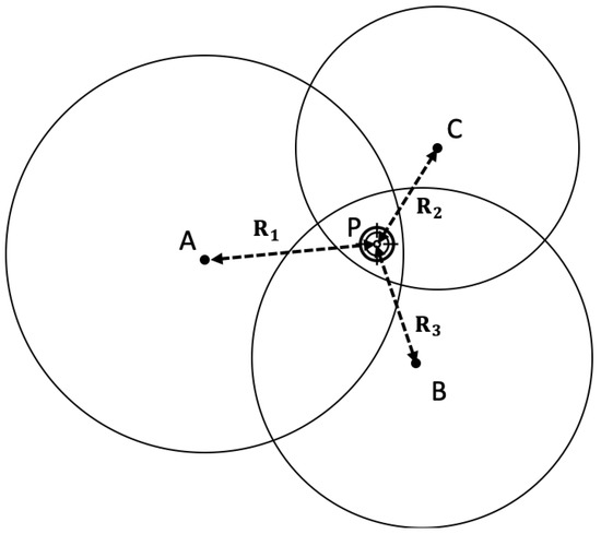 Assume that the coordinates of reference receivers, nodes A, B and C, are , and . Then, set the coordinate of the target object and the transmitter P as (x,y,z), as shown in Figure 3. At first, a ranging request is sent by P, with a record of the time of transmission. Receivers A, B and C then calculate the distance from themselves to P and using time difference between the transmitting time and the receiving time. The position of the transmitter P is calculated as follows: