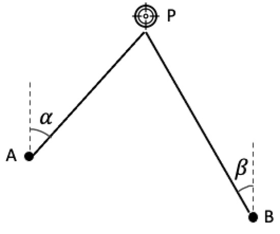 The operation of AOA is shown in Figure 5. Again, the target P sends out a signal. Nodes A and B determine the angle of arrival (incidence) for the signal (i.e., and ). Assume the locations of two reference nodes A and B can be represented with () and (). Then, based on the following basic geometric knowledge, it is possible to determine the location of P () through a series of iterative matrix operations.