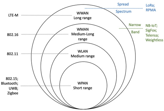 Low-power wide-area (LPWA) communication technologies have evolved rapidly in recent years with the development of the Internet of Things [19,20]. The benefits of the LPWA technique, as the name suggests, are low power consumption and stable and qualified connection capability over long range (i.e., a few kilometres) at low cost [21,22,23], and it can operate in different frequency ranges. Based on their different coverages, the relationship between LPWA technologies and general wireless networks is shown in Figure 6.