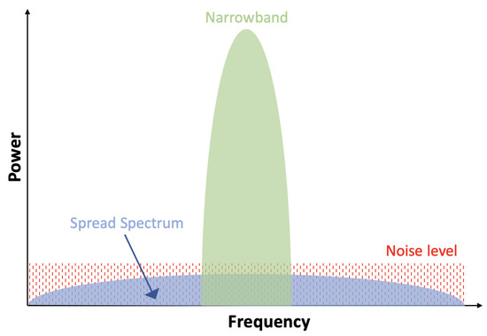Spread spectrum technology has been widely used in the military, industrial, and scientific area for a long time [42]. A typical spread-spectrum-based communication transmits data by spreading it with low power over a bandwidth that is much larger than the frequency band necessary to transmit the raw data signal. There is only one radio frequency channel for both uplink and downlink communications to share [37]. The biggest advantage of spread spectrum is the ability to transmit signals with a low spectral power density using varying carrier frequencies at the same amount of transmit power [37]. Overall, two of the most popular LPWA communication systems involved with spread spectrum technology are Long Range (LoRa) and Random Phase Multiple Access (RPMA).