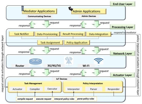 The proposed methodology relates to IoT devices explicitly represented in the designed reference architecture. Figure 1 presents the reference architecture consisting of four layers: end-user layer, processing layer, network layer, and actuator layer. The mediator and administrator applications that operate on communicating and admin devices, respectively, make up the end-user layer. The communicating devices are those that allow users to engage with actuators (which are IoT devices), while the admin devices are those that allow facility managers to enforce administrative policy rules on IoT devices. Some of the examples of communicating and admin devices are smartphones, laptops, desktops, tablets, and so on. The communicating devices and admin devices connect with actuators through the processing and networking layers. In the processing layer, the tasks and policies to be imposed on IoT devices generated by communicating and admin devices are handled. The tasks and policies are transferred to the Actuator layer through Wi-Fi, 3G/4G/5G, or routers, which are network layer components, once they have been processed. The IoT devices/Actuators compile and perform the job once it reaches the Actuator layer. They use the interpreter component to see if the admin has imposed policy rules on an intended task, and interpret the policy rules accordingly. When the actuators have completed their tasks, they communicate with the communication and admin devices via the network layer. The data that communicating and admin devices receive from actuator devices or vice versa, are combined, processed, and then sent to them through a task notifier as shown in the processing layer. In this manner, mediators and administrators send requests to actuators, while actuators provide replies back to mediators and administrators through the network and processing layers.