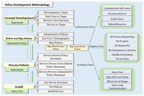 Define and Map Policies: The administrative policy rules must be defined in this phase after the core functions (or behaviours) of each smart device have been determined in the last phase. For example, what authorisation, obligation, and prohibition rules under an administrative policy are necessary if a robot is to execute its basic job of keeping track of products on a supermarket shelf? Socio-ethical policy rules are pre-defined as shown in Figure 2 because these rules are required to make a device behave in an ethical manner.