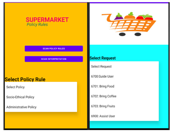 Process Policies: Following the third phase, the policy language documents are created independently for each targeted smart device. As a result, each device must load its three policy documents in order to understand what policy rules it must obey and how to interpret each socio-ethical and administrative policies while executing its core functions. For instance, if a robot has a core function of taking users to different locations, then the authorisation rule that applies to its core function is “guide-user". While guiding, the obligation rules that apply to robots are to “be-respectful", which means being polite with the users, “be-transparent-in-action", which means informing the users of the location where they are being directed by the robot, and “handle-uncertainty", which means avoiding obstacles or finding alternate paths in crowded areas. The prohibition applies is “moving out of range" (i.e., it should not move out of range) under the socio-ethical policy. The robot must know how to interpret these rules while guiding the user. Therefore, it is essential to load policy documents onto robots to let them understand the interpretation of each rule through the designed policy language documents. (The full document on robot socio-ethical policy is available: https://github.com/abatool-abatool/POLICY-LANGUAGE-SUPERMARKET-DOMAIN/blob/main/Socio-Ethical-Robot-Supermarket (accessed on 15 May 2022). Similarly, the complete document for the socio-ethical policy of smart cameras is available: https://github.com/abatool-abatool/POLICY-LANGUAGE-SUPERMARKET-DOMAIN/blob/main/Socio-Ethical-Camera-Supermarket (accessed on 15 May 2022), and the smart speaker socio-ethical policy document is available: https://github.com/abatool-abatool/POLICY-LANGUAGE-SUPERMARKET-DOMAIN/blob/main/Socio-Ethical-Speaker-Supermarket (accessed on 15 May 2022). The full document of the robot administrative policy is available: https://github.com/abatool-abatool/POLICY-LANGUAGE-SUPERMARKET-DOMAIN/blob/main/Administrative-Robot-Supermarket (accessed on 15 May 2022). Similarly, the complete document of the administrative policy for the smart camera is available: https://github.com/abatool-abatool/POLICY-LANGUAGE-SUPERMARKET-DOMAIN/blob/main/Administrative-Camera-Supermarket (accessed on 15 May 2022) and the smart speaker’s administrative policy document is available:https://github.com/abatool-abatool/POLICY-LANGUAGE-SUPERMARKET-DOMAIN/blob/main/Administrative-Speaker-Supermarket (accessed on 15 May 2022)).