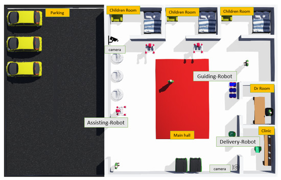 Figure 6 presents the scenario of a children’s hospital, in which a variety of smart robots and smart cameras must be deployed to carry out their primary responsibilities. According to the scenario, three types of robots must be installed throughout the hospital to do various functions, including guiding, delivering, sanitising floors, displaying videos, monitoring, and assisting. The delivery robot transports medicines from the clinic to parked automobiles outside the hospital as well as patient rooms. The guidance robot directs individuals arriving at the hospital to various locations as well as sanitise the floors/walls, while the assisting robot is in charge of helping visitors in answering their queries as well as displaying media files (exercise videos and games) for children as required. Moreover, the assisting robot pass the patient health details to doctors on fixed time intervals. The smart cameras are placed for security purposes, displaying the captured videos to administration and streaming live to make sure everything is good around. Following the methodological phases, each device must carry out its core functions while adhering to policies that must be mapped to its basic functions. Furthermore, each device will learn to understand policy documents in order to interpret policies.