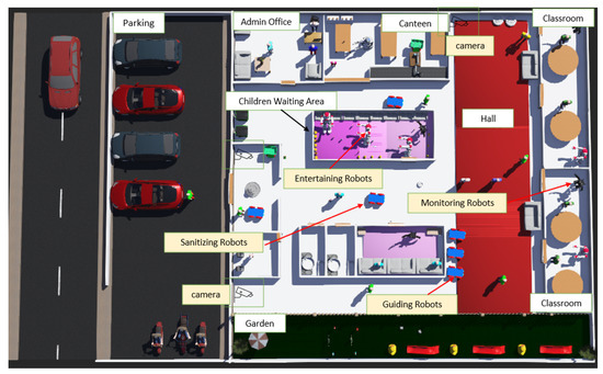 According to the scenario, four types of smart robots and multiple smart cameras must be deployed to do various functions including entertaining kids in the playing area, monitoring their daily activities, playing educational games, and guiding to various locations of the centre. The robots are responsible of monitoring the children activities, entertaining them in playing area, playing educational games in learning classes, passing the children activity details to teachers, sanitising the walls and floors, interacting with visitors to see if they need any assistance and guiding the visitors to the offices as well as children to the class rooms. On the other hand, smart cameras are responsible for streaming live, displaying stream videos to administration to make sure everything is good around and alerting on hazards.