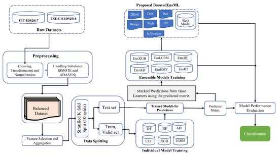 In the proposed IDS, we train, validate, and test different models based on random forest (RF) [16], AdaBoost [17], XGBoost [18], LightGBM [19], extra tree (ET), and decision tree (DT) [20] classifiers. Except for the DT, other algorithms already exist as ensemble classifiers based on the aggregation of various DT algorithms. A combination of these using a new method usually results in improved performance, in our case, for research. We develop the proposed model on the CSE-CIC-IDS2018 and CIC-IDS2017 datasets, which are the most comprehensive datasets for IDS development [21] currently available. IDS models and, generally, ML algorithms generalize better on balanced data by learning the same features from each class in the dataset. The two datasets used for this work contain imbalance; therefore, we handle the imbalance in our dataset using two main oversampling techniques, which are synthetic minority oversampling technique (SMOTE) [22] and adaptive synthetic sampling (ADASYN) [23,24]. In the NIDS domain, several ensemble ML approaches have been discussed [25,26,27,28,29,30,31], but none have used these classifier combinations to the best of our knowledge. Our proposed approach detects intrusion more accurately and precisely compared to existing systems [25,26,27,29].
