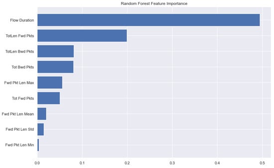 Hyperparameter optimization (HPO) is an automated method for picking classifier parameters to train the model. While model parameters (MPs) are learned and updated by the model during training, ML programmers define the hyperparameters for the classifier. This paper employed two search strategies to find the optimal hyperparameters for improving model performance. The and were used. While the RandomSearch algorithm randomly selects parameters based on the search space provided to each holding other parameters constant, the GridSearch CV exhaustively searches the grid of parameters and reports the best candidate parameters. Depending on the number of iterations (n_iter) defined, the RandomSearch can be faster than the GridSearch. Usually, the parameters to be tuned are defined based on the ML algorithm being implemented. For instance, in RF, the parameters tuned are max_features, n_estimators and oob_score, whereas the max_depth, n_estimators and learning_rate are tuned for the XGBoost classifier. When we compared the tuning results, we discovered that the parameters produced with GridSearchCV improved the model’s performance more than those obtained with RandomSearchCV; thus, all future training of all models was based on the GridSearchCV-tuned parameters. As previously indicated, some variables in the dataset are unimportant because they have little influence on the traffic flow characteristics. Hence, we used feature selection to determine which features contribute the most to determining network flow characteristics. Therefore, the random forest algorithm for feature importance was implemented, and the first 64 most important features, evaluated by the RF feature importance method, were chosen. Thus, our models were developed based on the chosen 64 features. Reducing these features helps to lower the model complexity and improve training cost while achieving the same performance output. The selected feature map is shown in Table 4.