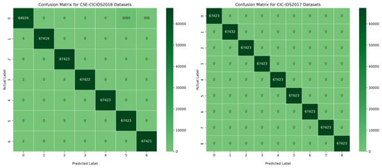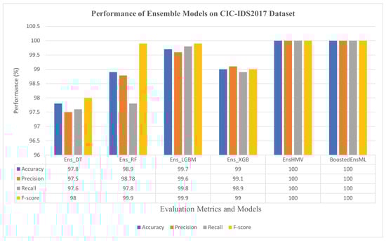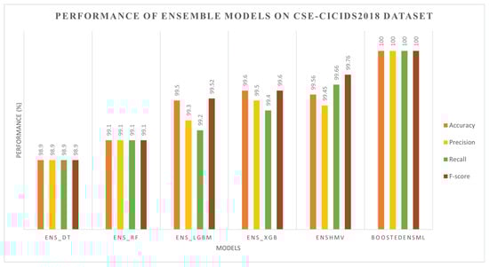 The results obtained for the ensemble approach are shown in Figure 3 and Figure 4, respectively, for the CIC-IDS2017 and CSE-CIC-IDS2018 datasets.
