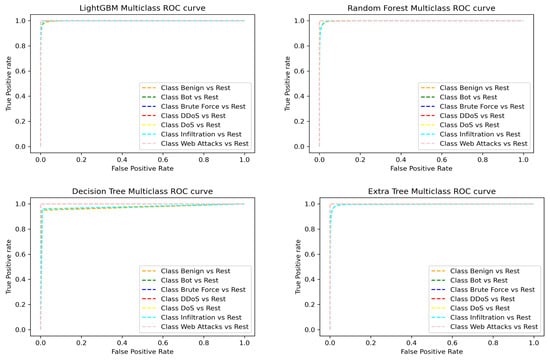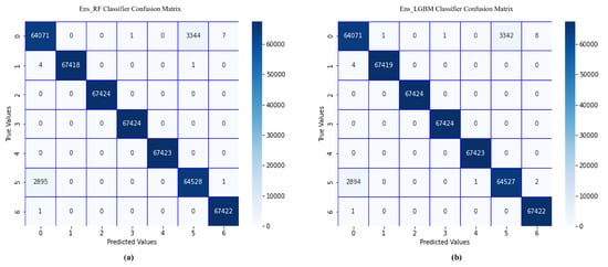 Since our task is based on multiclass classification, we show the confusion matrix for Ens_RF and Ens_LGBM classifiers in Figure 5. Almost all the various network traffic types were correctly classified. From the confusion matrix, we can see that during the test for brute force, DDoS, and DOS with the Ens_RF model, all the 67,424 data points in the dataset were correctly identified as either brute force, DDoS, or DoS with 100% accuracy. On the other hand, 64,071 instances were identified as benign, 1 instance was misclassified as DDoS, 3344 were misclassified as infiltration attacks, and 7 were misclassified as web attacks while detecting benign traffic on the CSE-CICIDS2018 dataset. Similarly, on the CICIDS2017 dataset, the Ens_LGBM had only 1, 1, 3342, and 8 misclassifications of bot, DDoS, infiltration, and web attacks, respectively, while detecting benign flows, showing an FNR of 0.05%.