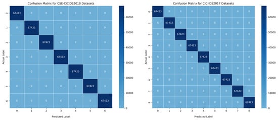 As shown in Table 2 and Table 3, our datasets contain severe data imbalances, having benign features in millions and attacks in thousands and hundreds. To handle the imbalance, we used two different sampling techniques to reduce the dataset size without affecting the model’s performance. We first oversampled the minority classes using SMOTE and ADASYN. These data sampling techniques generate synthetic instances for the minority class using its features. They ensure that the original information contained in the dataset is maintained. Next, we reduced the benign class using a random undersampling technique, which randomly removes some samples of the benign class without affecting its contribution to the model performance. Similar attack types were merged to obtain seven labels for CSE-CICIDS2018 (consisting of six attacks and one benign feature) and nine for CIC-IDS2017 (consisting of eight attacks and one benign feature).