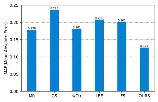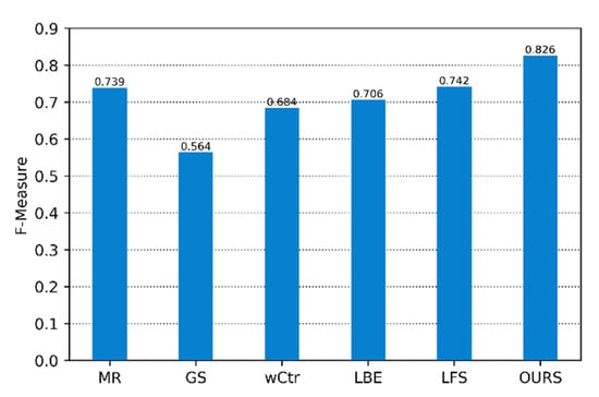 Figure 3 shows the quantitative evaluation of the method in this paper and other SOD algorithms on the PR curve. Figure 4 and Figure 5 are the comparison of the corresponding F-Measure and MAE values, respectively. According to these three images, it is clear that the algorithm’s performance in this paper is higher than that of other SOD methods on the three evaluation indicators, which shows the superiority of the SOD based on the focus of the light field in this paper. Compared with the SOD algorithm, the fusion method of focus and color cues can better exert their interaction and obtain more accurate saliency results.