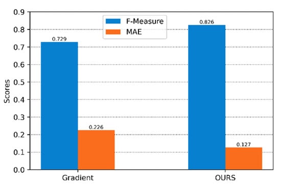 We calculated its two evaluation indicators, F-Measure and MAE, on the LFSD dataset, as shown in Figure 7. According to the F-Measure and MAE values, it can be seen that the results generated by the GrabCut calculation method based on the focus degree in this paper are higher than the calculation method based on the gradient as the focus degree in both evaluation indicators.