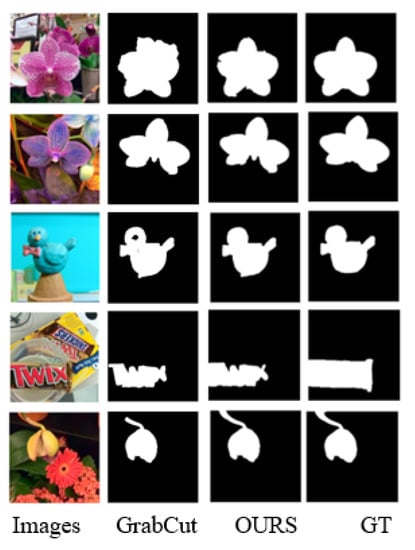 Using human interaction, we generated saliency maps for GrabCut annotating foreground and background regions. Figure 9 shows the comparison between the results of our method and the traditional GrabCut method. Although the boundary information of foreground and background is provided by manual interaction, it can be seen from the results in the third row that there are still some missed detections in the interior of the salient objects. At the same time, in the fifth row, from the root of the flower, it can be seen that, if the seed point is not fully labeled at the edge, the missed detection still occurs, and the focus clue provided in this paper is the focus result of the light field focus-stacked image at the foreground and background depths.
