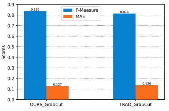 F-Measure and MAE obtained by our method and traditional GrabCut.
