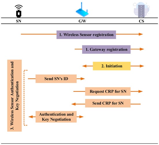 The existing wireless-sensor-authentication protocols do not consider the energy consumption of wireless sensors. Therefore, this paper proposes an efficient authentication protocol for IIoT-oriented wireless sensor networks. Firstly, wireless sensors and gateways are registered on the cloud server. Secondly, the gateway performs pre-authentication with the cloud server and saves the connection. Finally, the sensor sends its own identity information (challenge value) to the gateway. The gateway applies to the cloud server for the response value in the corresponding challenge–response pair. The gateway uses the response value to authenticate with the sensor. The protocol is divided into three phases: the registration phase, the initialization phase, and the wireless sensor authentication and key negotiation phase. Figure 2 provides a summary of the three phases.