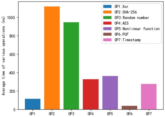 Our proposed protocol uses various operations, including XOR, a hash algorithm (SHA-256), an AES symmetric encryption algorithm, a nonlinear function, a random number generation algorithm, and a PUF challenge–response pair. The protocol involves timestamp operations []. We used the MIRACL cryptographic library and the GMP (a large number library) in Microsoft Visual C++ software to implement operations such as XOR, timestamp, nonlinear function, the SHA-256 algorithm, the AES symmetric encryption algorithm, and random number generation for large numbers. Experimental environment: CPU processor: Intel(R) Core(TM) i5-5200U CPU @ 2.20 GHz, memory: 8.00 GB, OS: Win10 64-bit. The experimental environment and parameters are summarized in Table 4. The PUF chip takes about 40 ns to generate a 128-bit challenge–response pair []. We performed the above operations on the computer. In order to ensure accuracy, we performed the above operations 100,000 times, and took the average value as the last execution time. Figure 5 shows the average durations of various operations. We reserve three decimal places for the test results, and the final quantization results were as follows: Xor: 115.158 ns, SHA-256: 1117.060 ns, random number: 947.094 ns, AES: 326.310 ns, nonlinear function: 326.160 ns, PUF: 40 ns, and timestamp: 275.610 s. It is worth noting that most devices today have AES hardware acceleration. Therefore, the AES test speed here is the speed after AES hardware optimization.