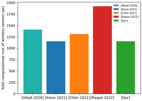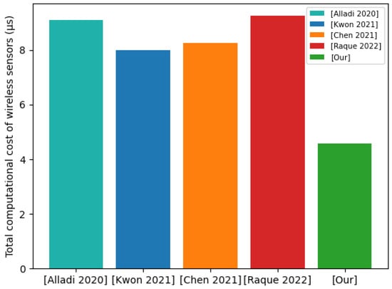 According to the average durations of various operations in Figure 5, we compared the total calculation costs of wireless sensors. Combined with the test results in Figure 5, we quantified the total computational costs on the wireless sensor side for the compared protocols. The total computational costs of the wireless sensor side of the [] protocol, [] protocol, [] protocol, [] protocol, and our proposed protocol were 9.110 μs, 7.995 μs, 8.271 μs, 9.252 μs, and 4.577 μs. Figure 6 shows the comparison results of the total computational costs of wireless sensors. In our protocol, the total computational costs of wireless sensors are significantly smaller than those of other protocols. Compared with the [] protocol, we reduced the total computational costs of wireless sensors by 49.8%. Compared with the [] protocol, we reduced the total computational costs of wireless sensors by 42.8%. Compared with the [] protocol, we reduced the total computational costs of wireless sensors by 44.7%. Compared with the [] protocol, we reduced the total computational costs of wireless sensors by 50.5%. It is worth noting that the [] protocol has the same network communication model as our proposed protocol. Under the same communication model, we reduced the total computational cost on the wireless sensor side by 49.8%.