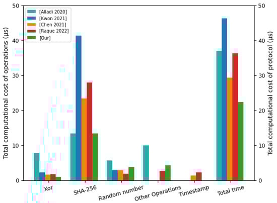 According to the average durations of various operations in Figure 5 and the number of operations required by the protocol in Table 5, we quantify the total computational costs of [] protocol, [] protocol, [] protocol, [] protocol, and our proposed protocol. We compared the total calculation costs of protocols and the total calculation costs of operations. The comparison results are shown in Figure 8. Figure 8 shows a comparison of the computational cost of various operations used by each protocol and the total computational cost of the protocols. Other operations include the AES symmetric encryption algorithm, nonlinear function, and PUF challenge–response pair. The total computational cost of the [] protocol was 36.932 μs. The computational cost of the Xor operation was 7.831 μs. The computational cost of the SHA-256 operation was 13.405 μs. The computational cost of the random number operation was 5.683 μs. The computational cost of the other operations was 10.013 μs. The total computational cost of the [] protocol was 46.360 μs. The computational cost of the Xor operation was 2.188 μs. The computational cost of the SHA-256 operation was 41.331 μs. The computational cost of the random number operation was 2.841 μs. The total computational cost of the [] protocol was 29.289 μs. The computational cost of the Xor operation was 1.612 μs. The computational cost of the SHA-256 operation was 23.458 μs. The computational cost of the random number operation was 2.841 μs. The computational cost of the timestamp operation was 4.291 μs. The total computational cost of the [] protocol was 36.363 μs. The computational cost of the Xor operation was 1.727 μs. The computational cost of the SHA-256 operation was 27.927 μs. The computational cost of the random number operation was 1.894 μs. The computational cost of the other operations was 2.610 μs. The computational cost of the timestamp operation was 2.205 μs. The total computational cost of the our proposed protocol was 22.404 μs. The computational cost of the Xor operation was 0.921 μs. The computational cost of the SHA-256 operation was 13.404 μs. The computational cost of the random number operation was 3.788 μs. The computational cost of the other operations was 4.291 μs. From Figure 8, we can clearly see that our proposed protocol has an advantage in the total computational costs.