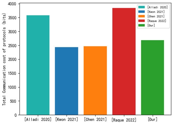 In this subsection, we compare the communication costs on the wireless sensor side. In the communication subsystem of the wireless sensor, the wireless transceiver circuit has four states, namely, transmit, receive, idle, and sleep states. Among them, the energy consumption of sending and receiving is relatively high []. Therefore, we counted the messages sent and received by the wireless sensor. The operations involved in the protocol include: XOR operation, the hash algorithm (SHA-256), the AES symmetric encryption algorithm, a nonlinear function, a random number generation algorithm, a PUF challenge–response pair, and a timestamp. We assume that the AES algorithm outputs 256 bits, PUF generates 128 bits challenge–response pairs, the hash algorithm generates 256 bits summaries, and the random number algorithm generates 128 bit random numbers. On the wireless sensor side, our proposed protocol needs to send messages and messages, and receive messages. According to the analysis in the previous section, the communication cost of the message is 256 bits, the communication cost of the message is 512 bits, and the communication cost of the message is 384 bits. Therefore, the communication cost of our proposed protocol on the wireless sensor side is 256 + 512 + 384 = 1152 bits. We compared the communication cost with those of other protocols on the wireless sensor side. The communication cost of our proposed protocol on the wireless sensor side is 1152 bits. The communication cost of the [] protocol on the wireless sensor side is 1408 bits. The communication cost of the [] protocol on the wireless sensor side is 1152 bits. The communication cost of the [] protocol on the wireless sensor side is 1312 bits. The communication cost of the [] protocol on the wireless sensor side is 1920 bits. Figure 7 shows the comparison results of wireless sensor side communication costs. Our proposed protocol is the same as the [] protocol in terms of the total communication cost on the wireless sensor side. However, it is better than [,,] protocols in terms of total communication cost on the wireless sensor side.