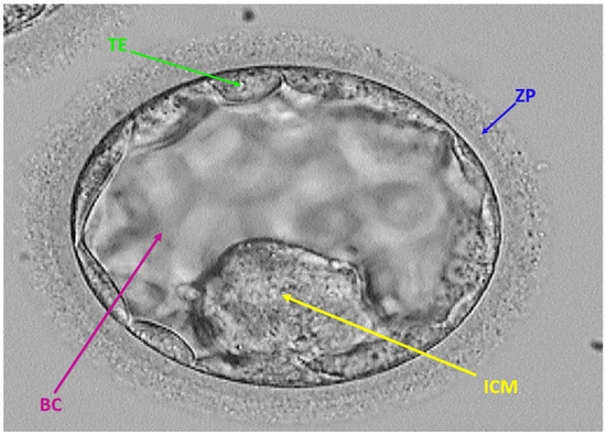 Embryonic components at the blastocyst stage. Inner cell mass (ICM), blastocoel (BC), trophectoderm (TE), and zona pellucida (ZP).