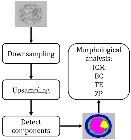 ICM is an embryo component that is formed inside the blastocyst before the transfer of the embryo to the uterus. It is located on one side of the embryo and it forms the trophoblast layer outside. The quality of ICM plays an important role in the success of in vitro fertilization [11,12]. BC is the cavity that is filled with fluid and it represents the formation of the blastocyst and the ICM is positioned in the corner of the blastocyst. BC creation shows the blastocyst creation on the fifth day, and its creation and specific morphology are important for successful IVF [13]. TE is the embryo component that creates the fluid to form the placenta. The TE later forms the ICM and the quality and formation are important to be analyzed before the embryo is transferred back to the uterus [14]. ZP is an important component that binds egg sperm and the thickness of the ZP is an important tool to check embryo quality. The thickness of the ZP starts to reduce as the embryo develops with time [15]. The manual observation of these components (ICM, BC, TE, and ZP) is time-consuming and requires efforts to detect the changes compared to the previous day.