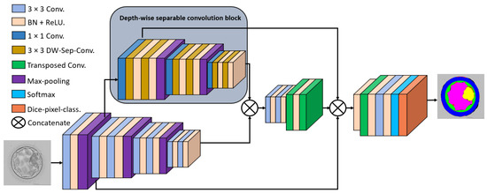 Deep learning has the potential to help medical practitioners to achieve robust diagnostic solutions by effective learning from the training examples [16,17,18]. Deep-learning-based semantic segmentation of these embryo components can aid embryologists to analyze morphometric properties of these components for viable embryo selection. This study proposes embryo components segmentation network (ECS-Net) that performs deep-learning-based semantic segmentation to accurately detect these components for embryo analysis. The ECS-Net is based on two streams of base convolutional block and the separable convolutional block, these block extracts the important features that are later concatenated to produce a rich dense feature for better segmentation performance.