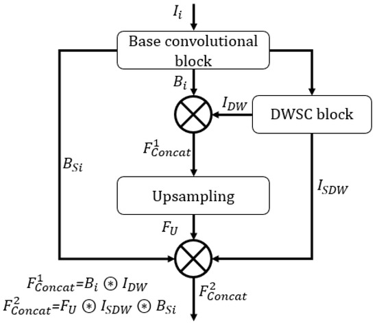 Inside the upsampling block, the upsampled feature from upsampling block is further enhanced by adding spatially rich features , and from the DWSC block, and base convolutional block, respectively. Hence, the aggregated final feature is produced by depth-wise concatenation of , , and The give by Equation (2)