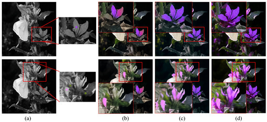 Figure 6 shows an example demonstrating the importance of long-range dependency in hint-based colorization. The first row in the figure shows how colorization is performed when there is no color hint in an object. In the case of Zhang’s CNN-based model [7], the flowers in the region where there was no color hint were colorized using the green color hint in the surroundings. On the other hand, in the case of the proposed transformer-based model, the flowers were colorized in purple based on the color hint information of other flowers using the long-range dependency. The images in the second row show the results for the case where a hint is given in only one of the four petals. In the case of Zhang’s model [7], the petal with the hint and the petals on the right side within the region that could be covered by the receptive field were colorized correctly. But the rest were not colorized, showing incomplete colorization. In the case of the proposed transformer model, colorization was performed properly using the color information of the petal that had the hint. As such, long-range dependency is important in hint-based image colorization tasks [48].