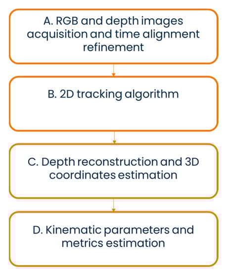 A sequence of steps was implemented to reconstruct the time series of the 3D coordinates of the selected points from the recorded RGB-D videos and to extract the associated GM metrics (Figure 1).